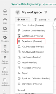 mlflow.set_experiment("Prediction")Ele criará um novo experimento chamado “Prediction” em seu espaço de trabalho. Contudo, você pode verificar as experiências de aprendizado de máquina no Microsoft Fabric para saber mais sobre “Experiência”.