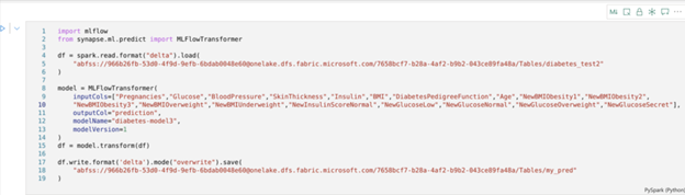 Observe que o código fornecido nesta seção foi projetado especificamente para o Microsoft Fabric Notebook. Ou seja, tentar executar o código em outras plataformas, como Colab ou qualquer outra plataforma, pode resultar em erros. Isso ocorre porque a função PREDICT utilizada no código exige que os modelos sejam salvos no formato MLflow, que é suportado principalmente pela linguagem Spark.