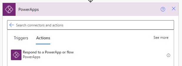 Agora, para enviar de volta uma resposta para o Power Apps que está chamando,vamos pesquisar novamente o conector Power Apps. Em seguida, selecionamos a ação Respond to a Power Apps or flow