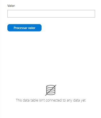 Em meu aplicativo Canvas, tenho esta estrutura onde tenho uma caixa de texto chamada ‘ ValueToSend ‘, um botão chamado ‘ ProcessButton ‘ e uma DataTable chamada ‘ ResultTable ‘ para mostrar o resultado.