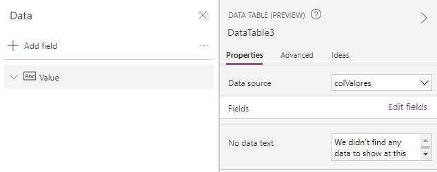 A seguir, como desejo exibir o resultado em uma DataTable, selecione o tipo de fonte de dados a coleção que criamos acima. Neste caso colValores e o campo Value para a exibição dos valores.