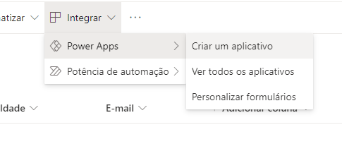 2. Em seguida, navegue na barra do SharePoint e clique no menu ‘Integrar’ e, a seguir, clique no menu ‘Power Apps’ e ‘Criar um aplicativo’ para nossa lista do SharePoint.