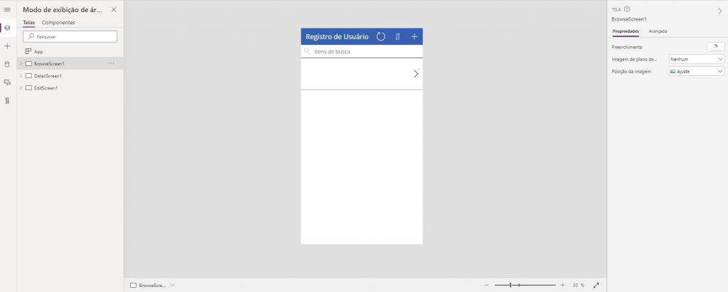 5. Na tela a seguir, o aplicativo foi criado contendo 3 telas, a tela de pesquisa, a de detalhes e também a de edição. Manteremos o aplicativo da forma padrão.