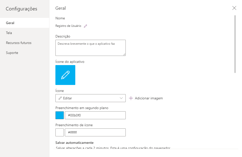 7. Após o teste, salve o aplicativo e vá para as configurações do aplicativo para configurar as caracteristicas a seguir (em nosso exemplo manteremos as caracteristicas padrão):