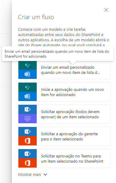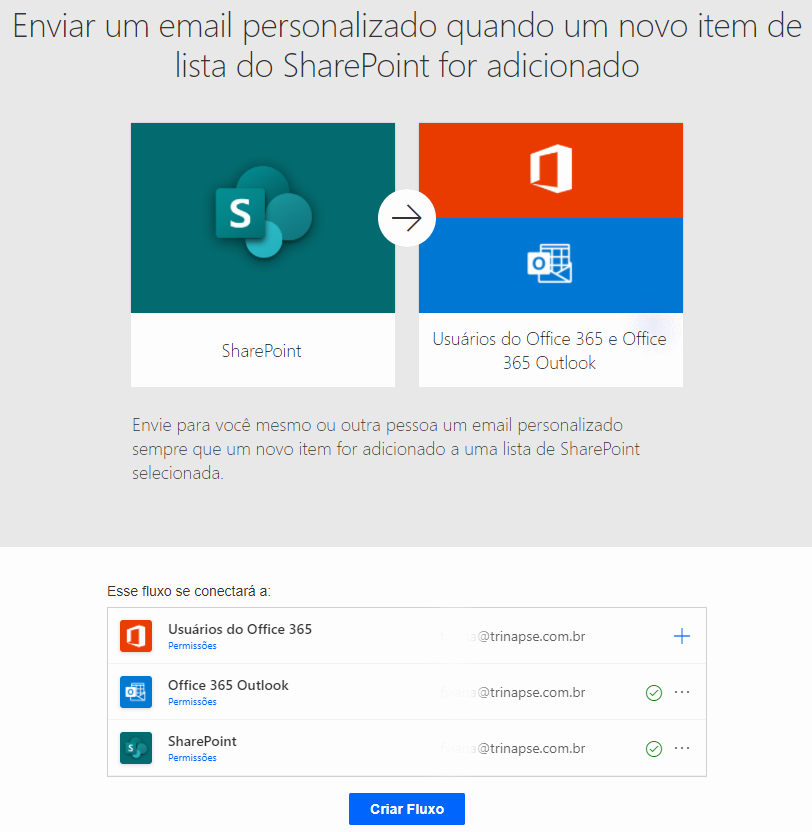 2. Clique em ‘Criar um fluxo’ e selecione o fluxo ‘Enviar um e-mail personalizado quando um novo item da lista do SharePoint for adicionado’ na tela seguinte.