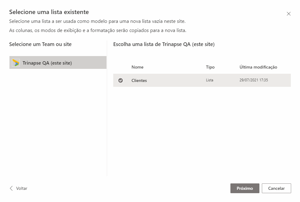 3. Selecione De uma lista existente, dê um nome à sua nova lista , escolha uma lista que deseja copiar (você pode selecionar qualquer lista personalizada à qual tenha acesso, pode ser uma lista neste site ou em qualquer site) e, em seguida, clique em Criar