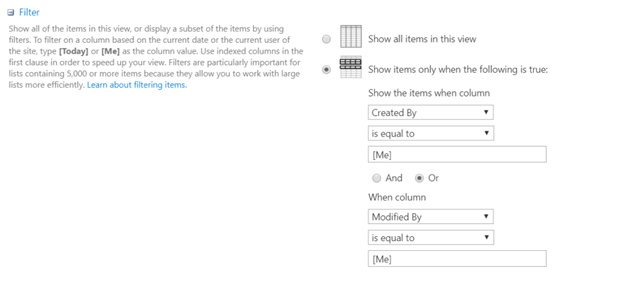 NOTA: este exemplo mostra apenas itens criados por OU modificados pelo usuário atual conectado. Se você deseja que seu filtro mostre apenas os itens em que ambos os valores são verdadeiros, altere OR para AND .