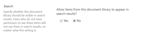 Atualize a configuração de permitir que os itens desta biblioteca de documentos apareçam na configuração avançada dos resultados da pesquisa para garantir que os itens não fiquem visíveis na pesquisa.
