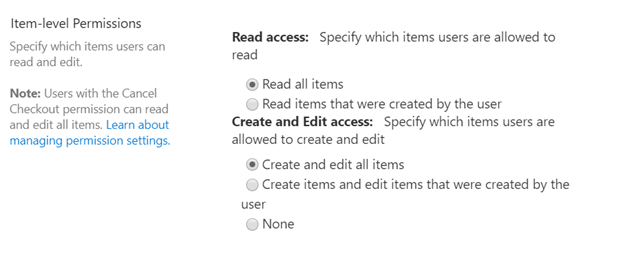 Com listas, em configurações avançadas, há uma opção de configuração adicional – permissões de nível de item que permitem especificar quais itens os usuários podem ler e editar.