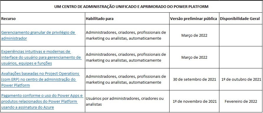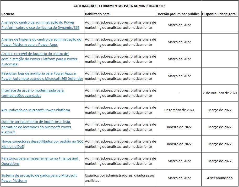 Este tópico lista recursos lançados de outubro de 2021 até março de 2022, do Power Platform. Ou seja, como este tópico lista recursos que talvez ainda não tenham sido lançados, os prazos de entrega podem ser alterados e a funcionalidade projetada pode não ser lançada. Assim, para obter mais informações, acesse a política da Microsoft.