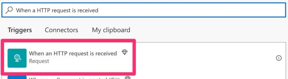 Para encontrá-lo, você pode procurar por “Quando uma solicitação HTTP é recebida”. Se parece com isso: