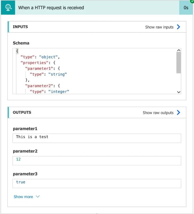 { “headers”: { “Connection”: “keep-alive”, “Accept”: “*/*”, “Accept-Encoding”: “br,gzip,deflate”, “Host”: “prod.westeurope.logic.azure.com:443”, “User-Agent”: “PostmanRuntime/7.28.4”, “Postman-Token”: “2b636af8-62a5-4ff7-b160-cb06ad59f510”, “Content-Length”: “80”, “Content-Type”: “application/json” }, “body”: { “parameter1”: “string parameter”, “parameter2”: 1, “parameter3”: false } }