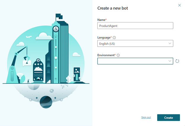 Abra o painel de bots e clique em novo Bot. Digite o nome, selecione o idioma e o ambiente e pressione criar. Isso criará um novo bot de agente virtual poderoso.