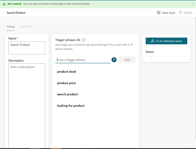 Uma vez criado o bot, precisamos definir um tópico e adicionar algumas fases. O tópico é uma forma de separar os diferentes trabalhos que um bot pode realizar e as fases são usadas para ativar um tópico específico. Bot pode alternar entre vários tópicos e um tópico é acionado por uma frase. Então, vamos adicionar um tópico “Pesquisar Produto” e algumas frases comuns.