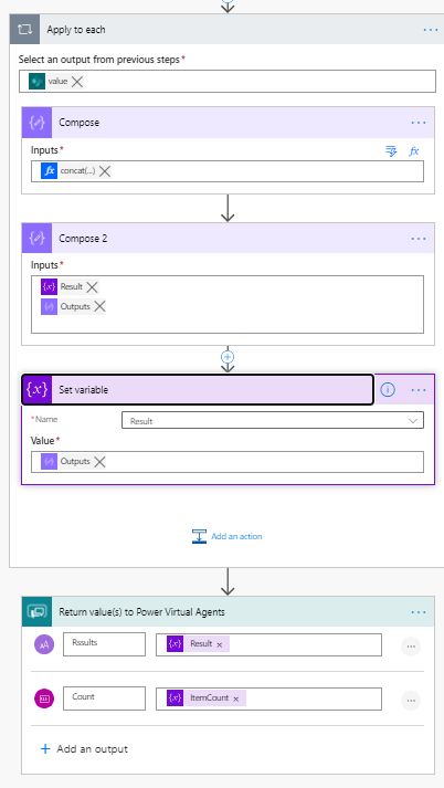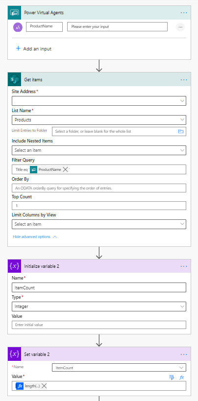 Agora vamos usar “Call an Action” para chamar um fluxo do Power Automate para buscar os itens da lista do SharePoint. ProductName será usado como uma entrada. No fluxo, usaremos GetItems com o título FilterQuery eq ‘ProductName’ para obter os itens com base na entrada do usuário e, em seguida, retornar a contagem de itens e os resultados de volta ao bot.