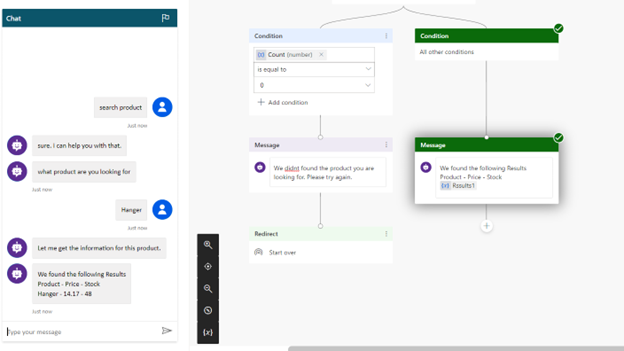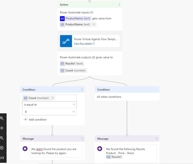 O fluxo de automação de energia retornará duas variáveis para o agente virtual de energia contendo a contagem de itens e os resultados. Agora vamos usar a condição para verificar Count = 0, informar ao usuário nenhum produto encontrado e começar de novo. Se Count > 0, mostre os resultados.
