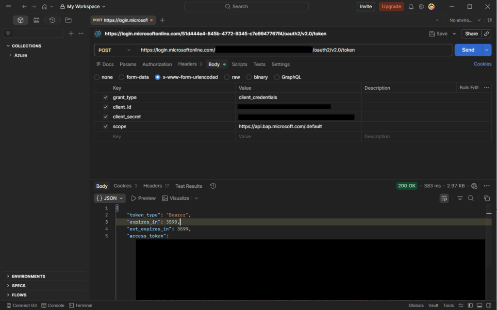 https://login.microsoftonline.com/{tenantId}/oauth2/v2.0/tokenParâmetros principais: