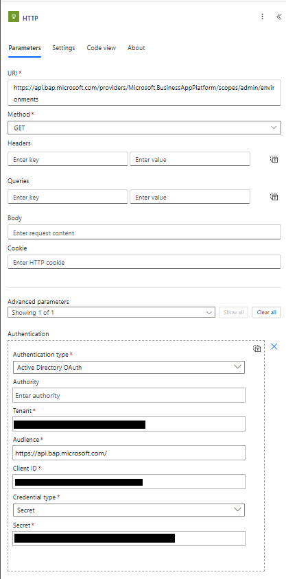 Chamada GET para a Power Platform API.