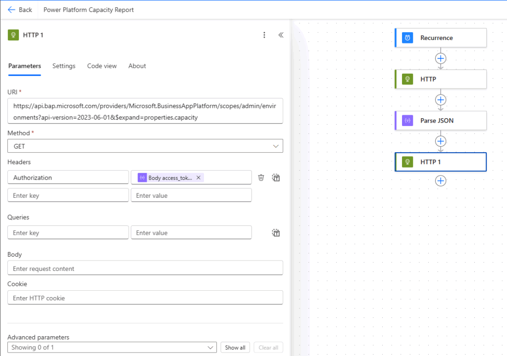 https://api.bap.microsoft.com/providers/Microsoft.BusinessAppPlatform/scopes/admin/environments?api-version=2023-06-01Para obter as informações de capacidade, utilizamos o parâmetro: