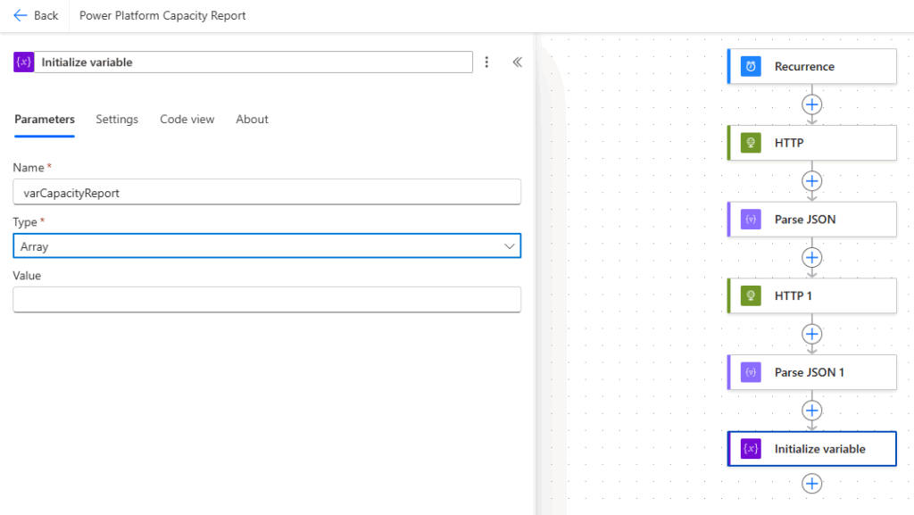 Essa arquitetura permite criar um relatório diário automatizado de capacidade da Power Platform.