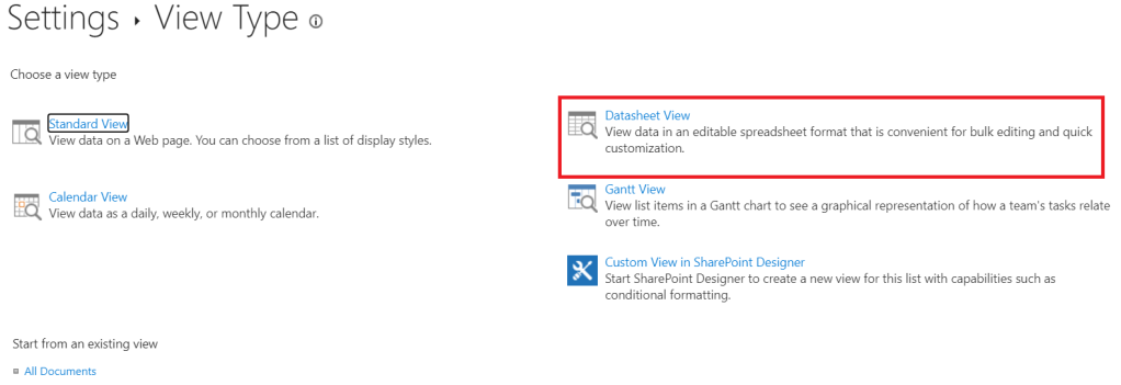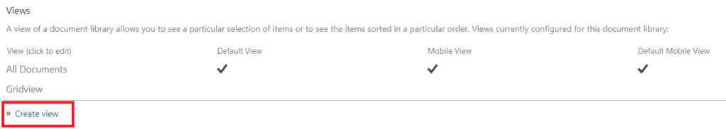 Assim, depois de dar uma olhada, com certeza esse era o caso e a opção não estava presente. Portanto, a primeira coisa a ser observada sobre essa biblioteca de documentos específica foi que a exibição padrão tinha o agrupamento habilitado em uma coluna específica. Ao tentar replicar o problema, a princípio, quando criei uma nova biblioteca de documentos, o botão editar na visualização em grade estava presente: