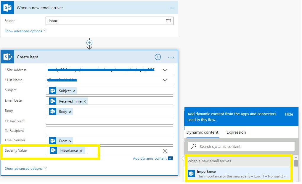 Uma coisa a ser observada aqui é que, embora o nome da coluna da Lista do SharePoint seja Severidade ao definir seu valor em Fluxo da seção Conteúdo Dinâmico “ Quando um novo e-mail chega → Importância ”, o Fluxo refere-se internamente a este campo como Valor de Severidade , como na captura de tela abaixo .
